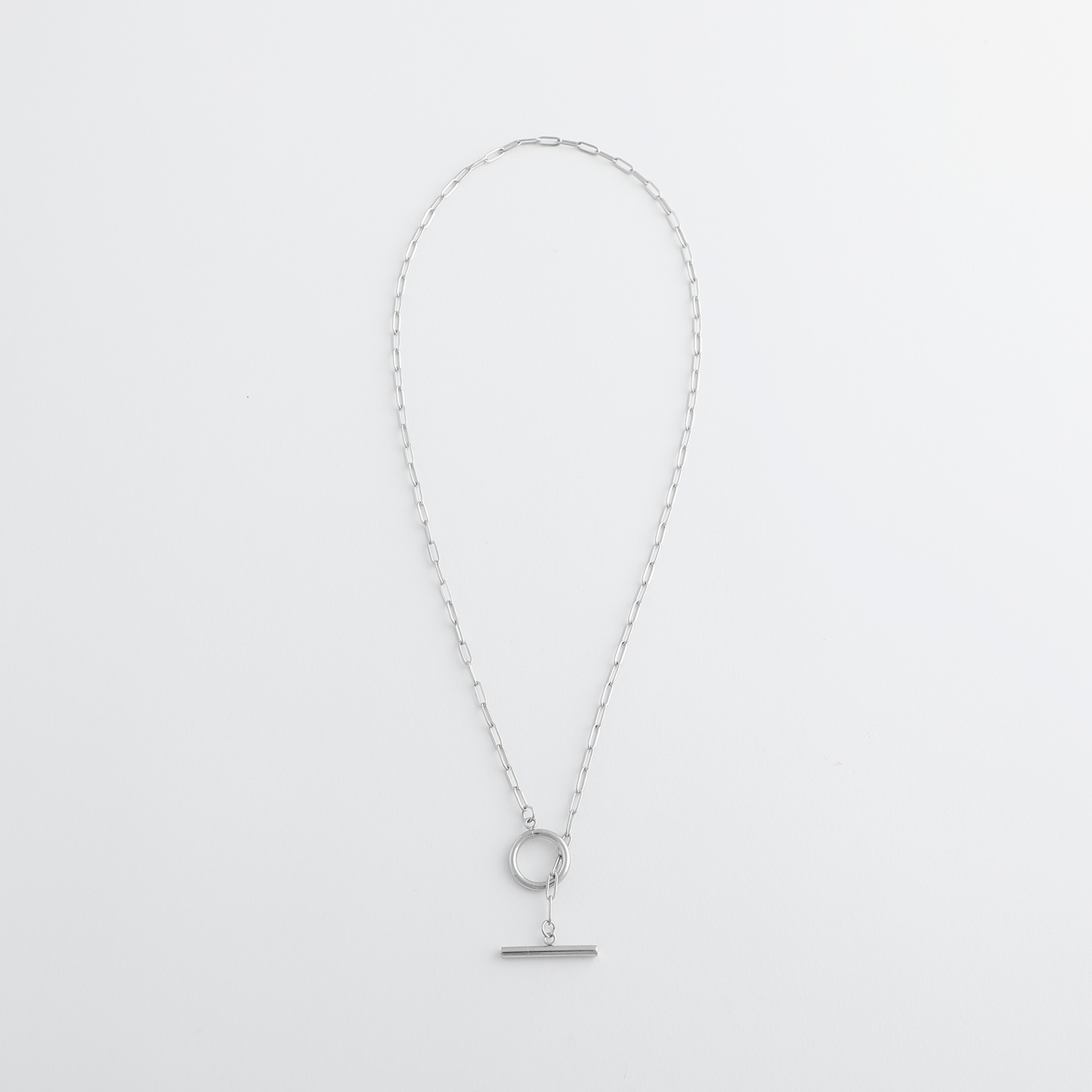 T字バーにフープを引っかけて留めるマンテル仕様で、マンテル部分をネックレストップとしても楽しめます。