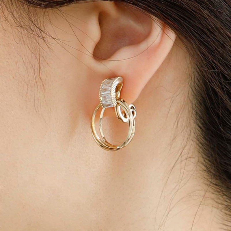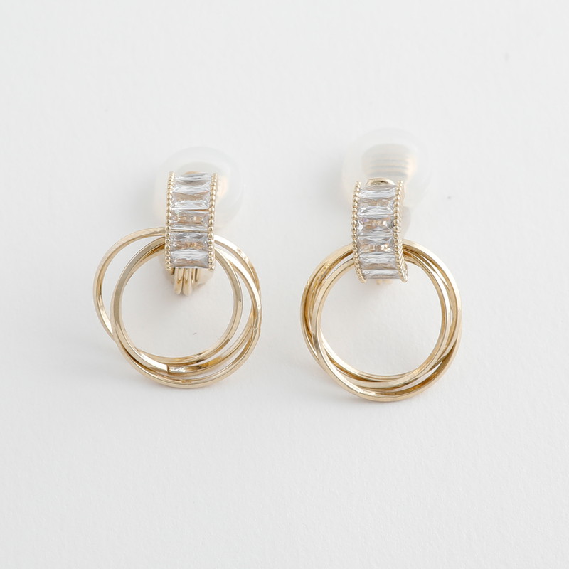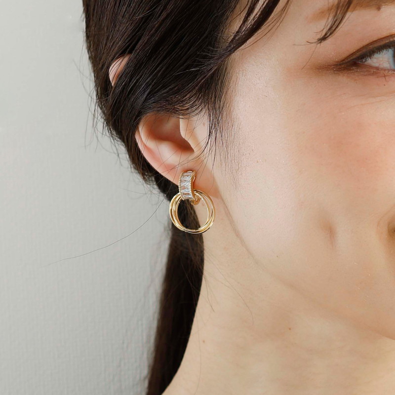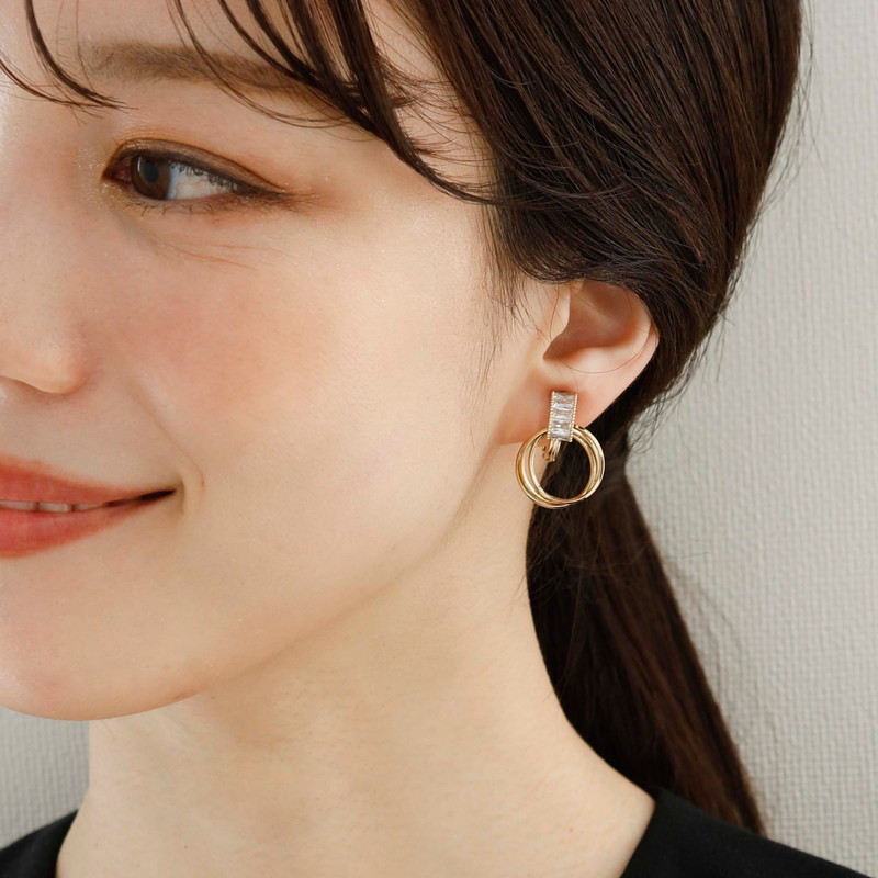 ガラスストーンのキラキラと揺れる三連フープが女性らしく、