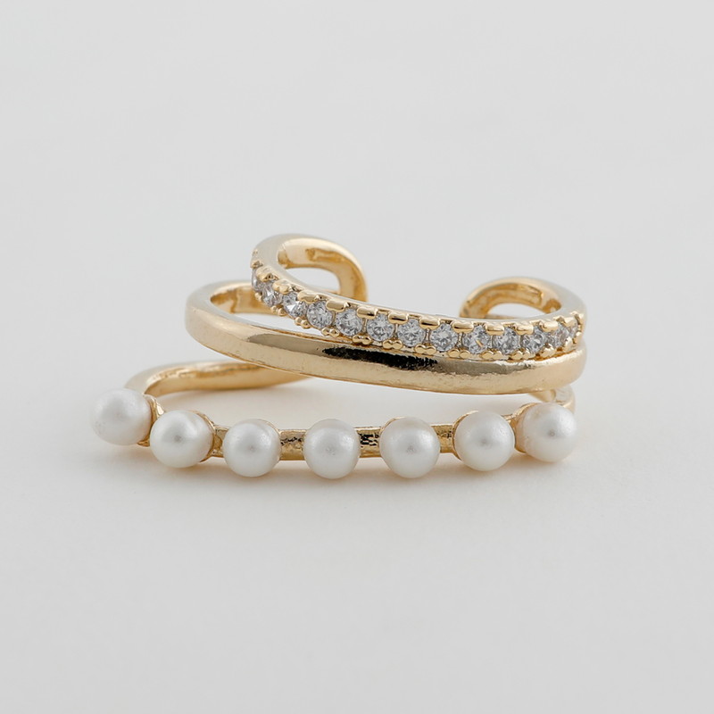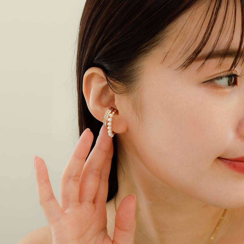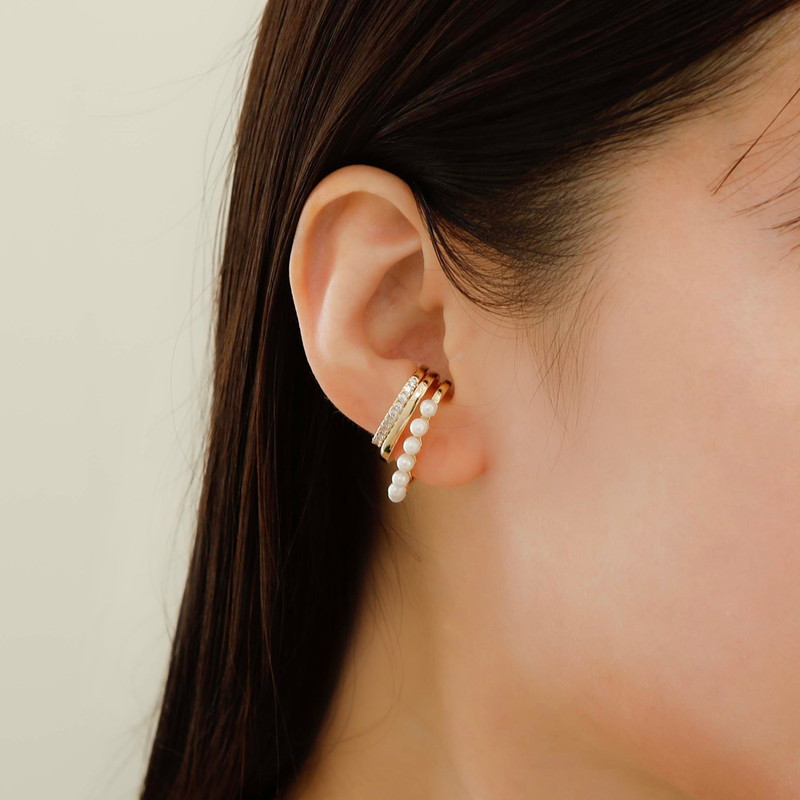 パールとガラスストーンの3連デザインになったイヤーカフ。耳元にアクセントをプラスしてくれます。
