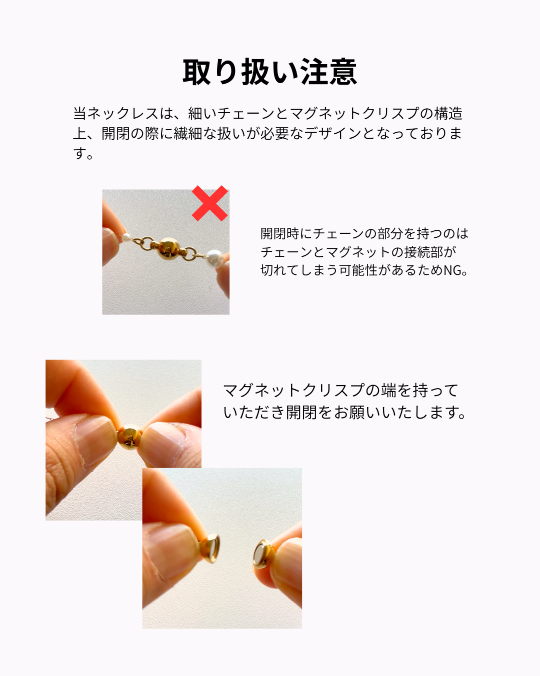 | 注意事項 | ・表示される画像の色は、モニターやブラウザ等によって実際の商品と若干異なる場合がございます。 ・アクセサリーは壊れやすいため、ぶつけたり落としたりしない様にお取扱いにはお気をつけください。 ・皮膚に異常を感じた時はご使用をおやめいただき専門医にご相談ください。 ・商品の特性上、ご使用済みの返品・交換はいたしかねます。 |