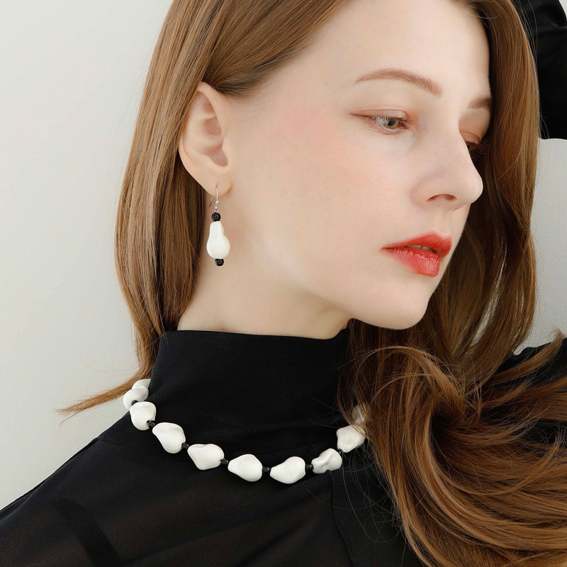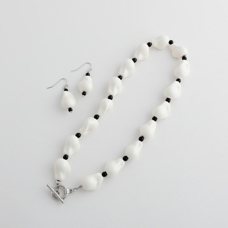 ひとつひとつ形の異なる大粒ビーズが連なるデザインは、