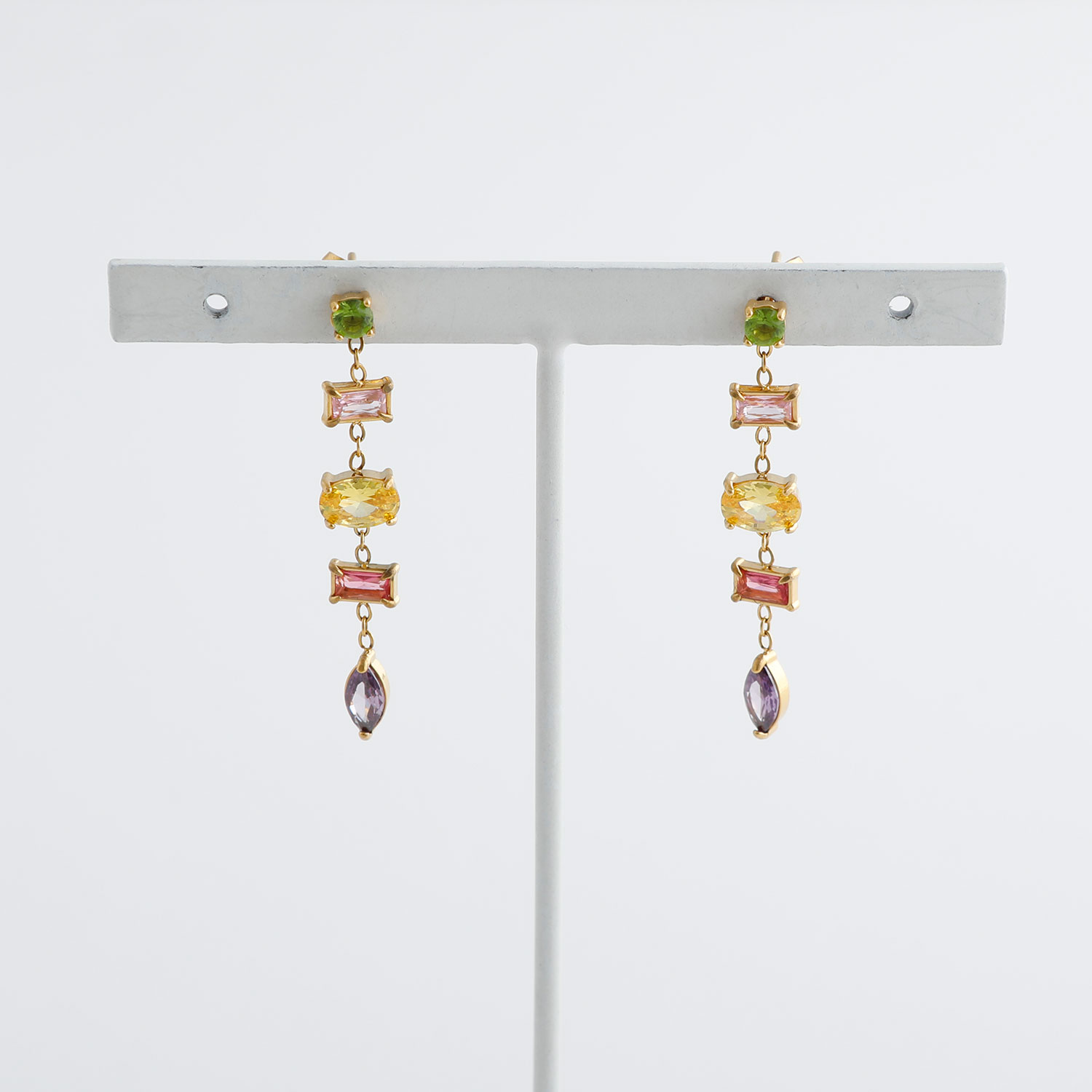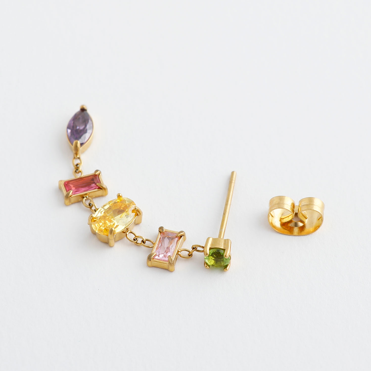 光を受けるたび、カラフルなキュービックジルコニアがやさしく揺れて、顔まわりにさりげない華やぎを添えるピアス。
