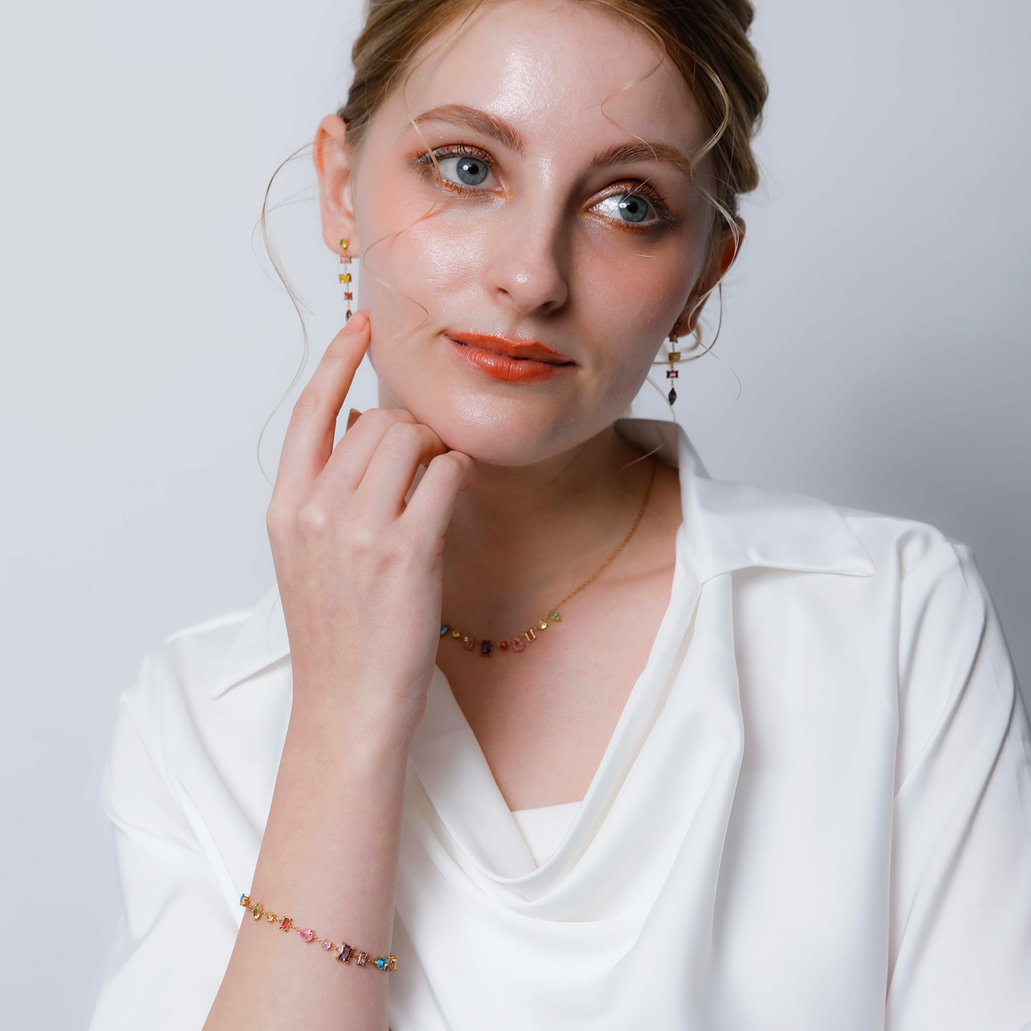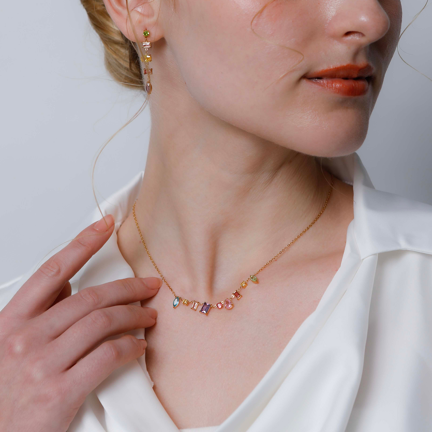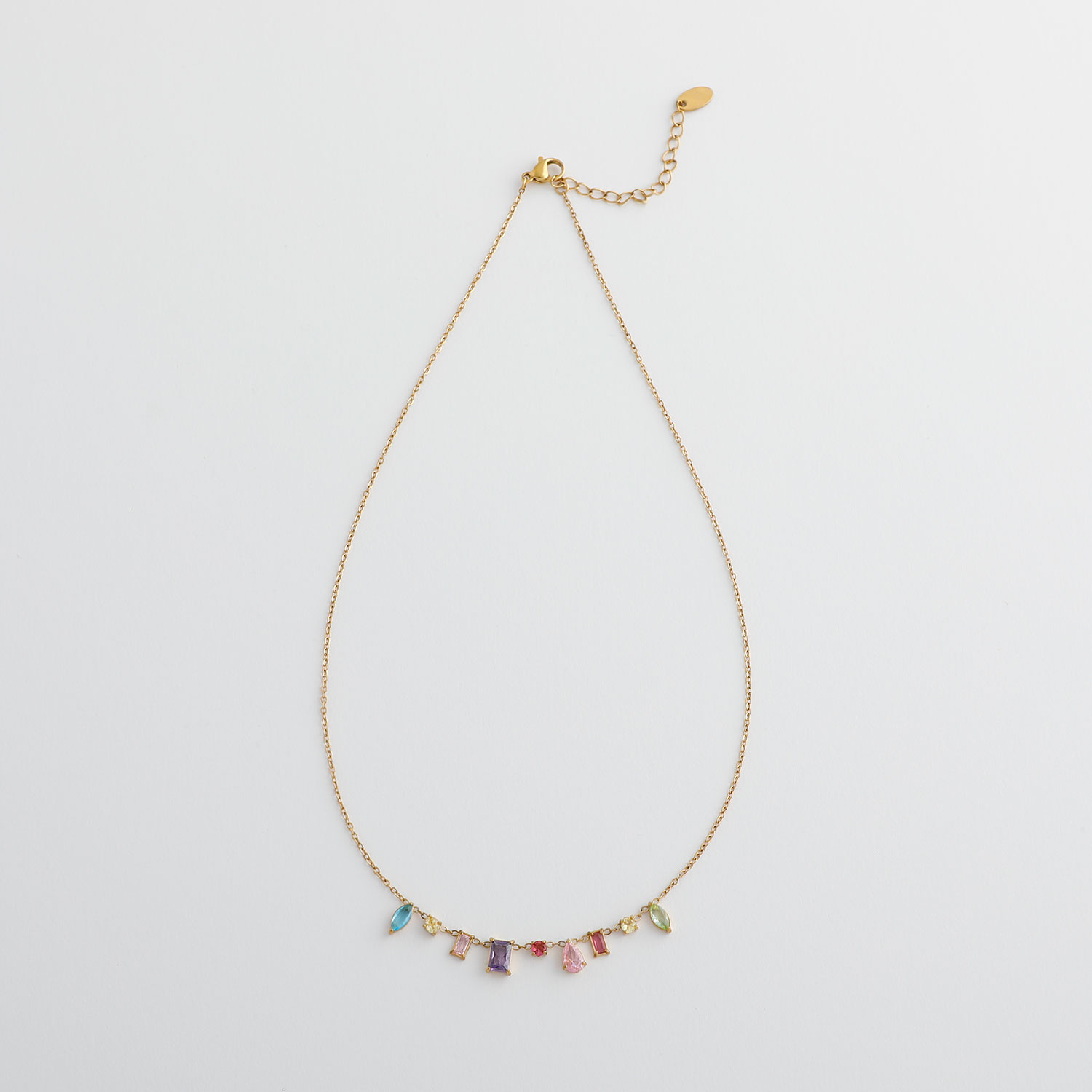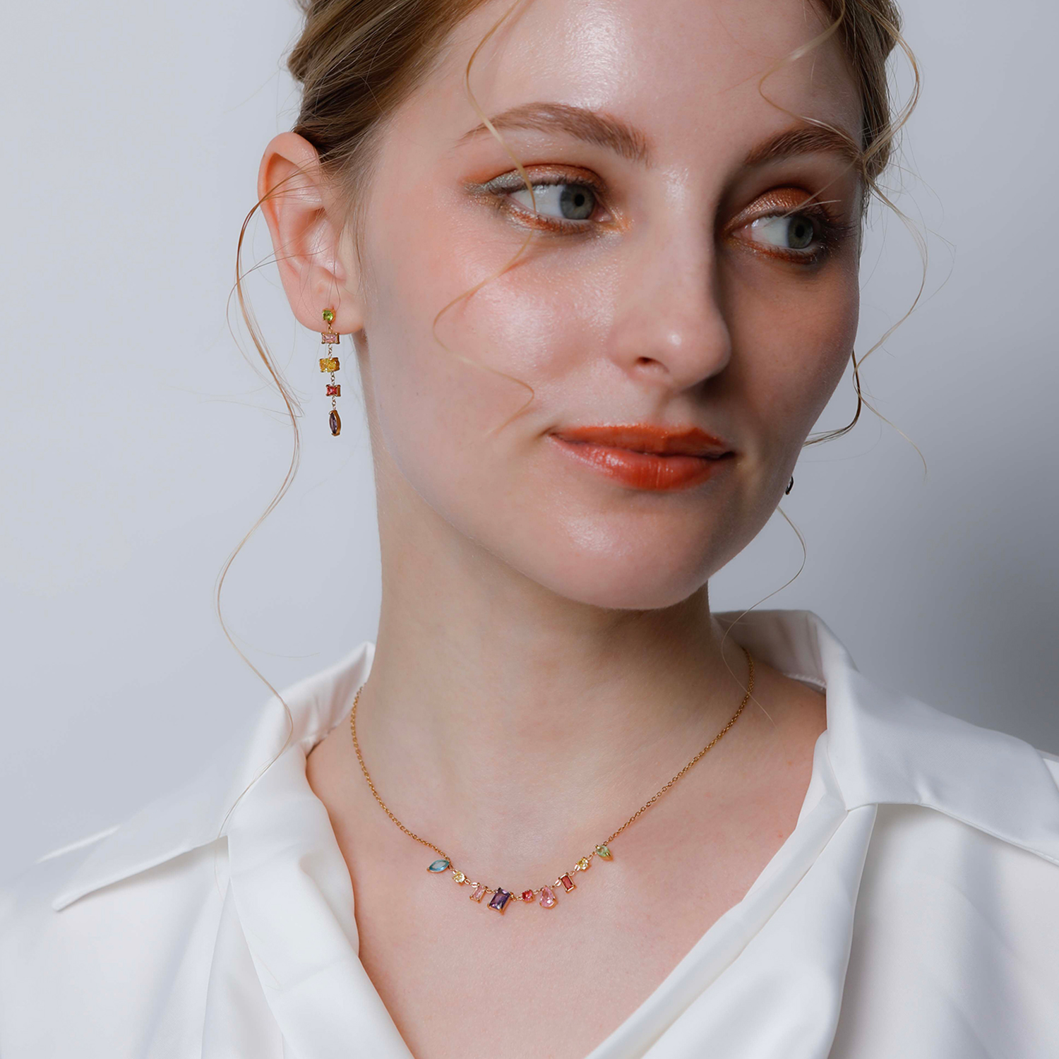 まるで宝石箱をひっくり返したような、鮮やかな色彩が胸元を彩るネックレス。 高品質なキュービックジルコニアを贅沢に連ね、デコルテに沿ってキラキラと眩い光を放ちます。